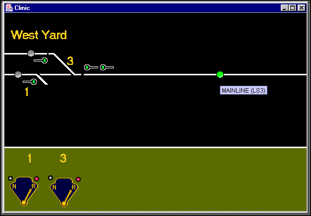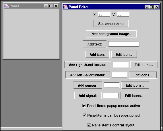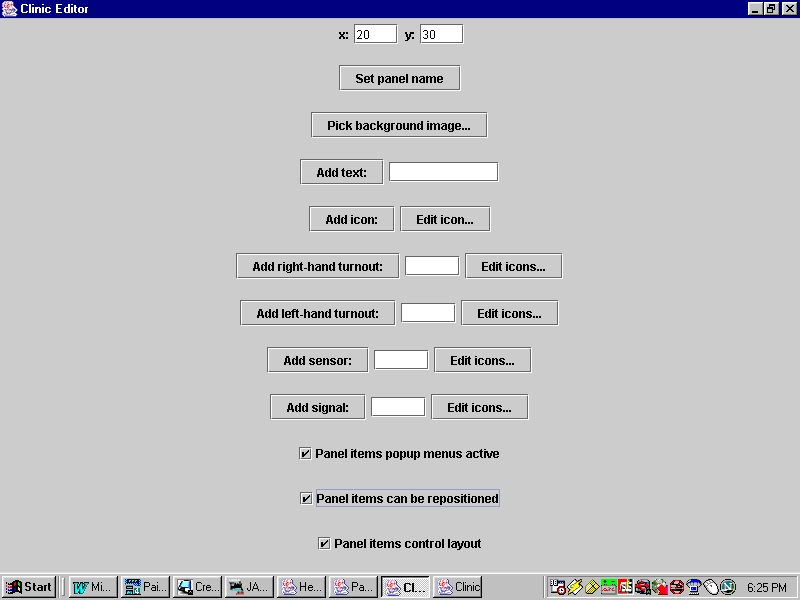 For my panel I used a drawing program call Paint Shop Pro. I created a simple Black "track" area on the upper portion of the graphic, and an Olive green area to place the control levers and indicator lights. The black area will have a 3 pixel wide line that will represent the tracks under the dispatcher's control, including any switches, signals, and occupancy detectors. You would draw the simple schematic representing this track and the other items will be added on top of your background. There are a ton of icons included in the resources\icons folder and you can use your painting program to create any custom icons you might want. I created some PRR position lights for my use with Bob Jacobsen's help.