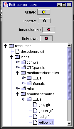 The green LED on the top section is identified as LS3, LocoNet-Sensor 3 and its user name is Mainline. After you create a sensor in the sensor table you must then choose an icon from the available icons that come with the program to represent that sensor. Keep in mind that a sensor will have more than one state. You select this from the panel editor.