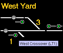 As shown here, LT1 is in place and can be identified by "hovering" the mouse over the location after you have placed the switch. The next image shows all of the icons associated with Switch 1 or the West Crossover. On the top is the track diagram icon. The icon lays over the three pixel line you drew for your track schematic.