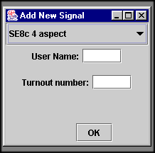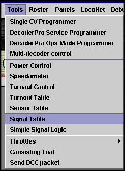 The final piece of the puzzle is the signals. Just like the evening news, I have saved the best part for last. This is probably the most interesting and challenging part of this process. You must first create you signal table by selecting that option from the Tools menu. Then you select "Add", then select the SE8c aspect from the drop-down menu. You must then enter your name for the signal in the "User Name" box, then enter the turnout number assigned to the signal head according to the SE8c address and signal assigned to the appropriate aspect. To do this you must have the SE8c manual and READ it. I know this goes against every instinct that you know but this is essential. After you have added all of the signals to the signal table, you are now ready to do some real work.