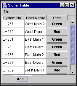 After you place all of your signals on the background it will be time for you to see the fruits of your labor. Open the signal table, select any signal in the table and click on the "State" button. Find the signal you just changed on your panel and see what happened. It will now match the state shown in the table. If your preferences are set up to work through the Locobuffer and your layout LocoNet is powered up, you can walk out to the layout, find your signal, and it should also show what the table shows. The rest is simply repetition. Add a signal, test a signal, have a drink of celebration, add another signal, test the signal, have another drink. Continue this process until one of these options happen.