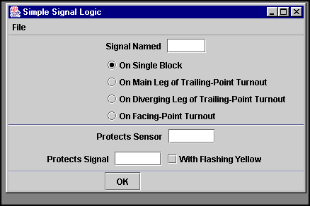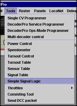 You will now try to figure out how to make your signals work like the prototype you are modeling. The Simple Signal Logic tool is only a guide as to how you want the aspects to appear. Keep in mind, the first word in this tool is SIMPLE. It is not designed to provide correct aspects for a complex interlocking plant. It will protect sensors and signals associated with it but if you are modeling 30th Street Station, or the NYC's entrance to Chicago, you will have to learn to do some JAVA scripting. Unfortunately, this is not what this clinic is all about. The menus above will show the selections you have to make. In the Simple Signal Logic tool panel, the first thing you need to enter is the line is the "Signal Name". This is the system name that is assigned by the program automatically after you created the signal in the Add New Signal tool. You can look the system name up in the Signal Table that was created while you were naming your signals.