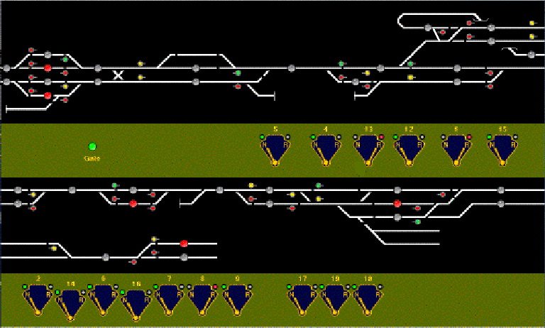 To edit the icons find one that suits your needs from the selections like the ones above and select it. Then click on the icon you want it to represent and it will replace the default in the boxes at the top. You will see what it looks like. Make a selection for all of the icons in this menu and they will remain your selections as long as you have the program running. When you shut the program down, AFTER YOU HAVE SAVED YOUR PANEL !! the next time you open it, the icons will have reverted back to the program defaults shown here. There are signals for searchlights, sensors, track pieces and more. If what is here doesn't meet your needs, create some with that paint program you used to make you background image. From this point on, the process is simply a matter of repetition. After the sensors are added, test them on the panel. If they change, you can see the change in the related table. Once you have seen them change on the screen, you can test them by connecting the computer to you layout's interface and running a train. When the train crosses over the detector section, the indicator should change on the screen. There is nothing in the world like the first test of this program and having it work.