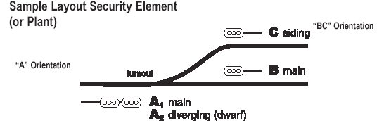 The sample shown here, SE8c manual page 5, shows all of the choices the SE8c provides. A1 Main, A2 Diverging signaling at the points, B Main protection at the Mainline frog, and C Diverging protection at the siding or diverging route frog. Placing your signals is exactly the same process that you used when you placed your switches, levers, or sensor icons. Edit the signal icon in the panel editor, choosing the appropriate style and direction for the signal, then using the "Add Signal" in your panel-editing tool, placing it on the background of your panel.
