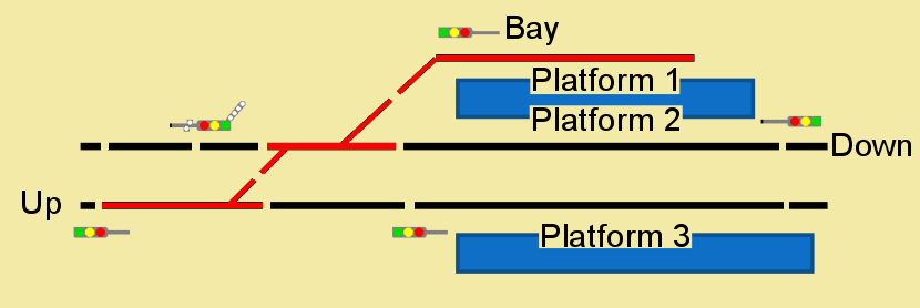 The arrangement of blocks is shown below, with the three track segments coloured red linked to individual inputs on the BD4 detector (the fourth input was not used). The blocks which are coloured black were used in software but not attached to hardware detectors. With the hardware detectors, the system can tell that a train is in the bay, crossing the junction, or on the Up line before the west-most signal.