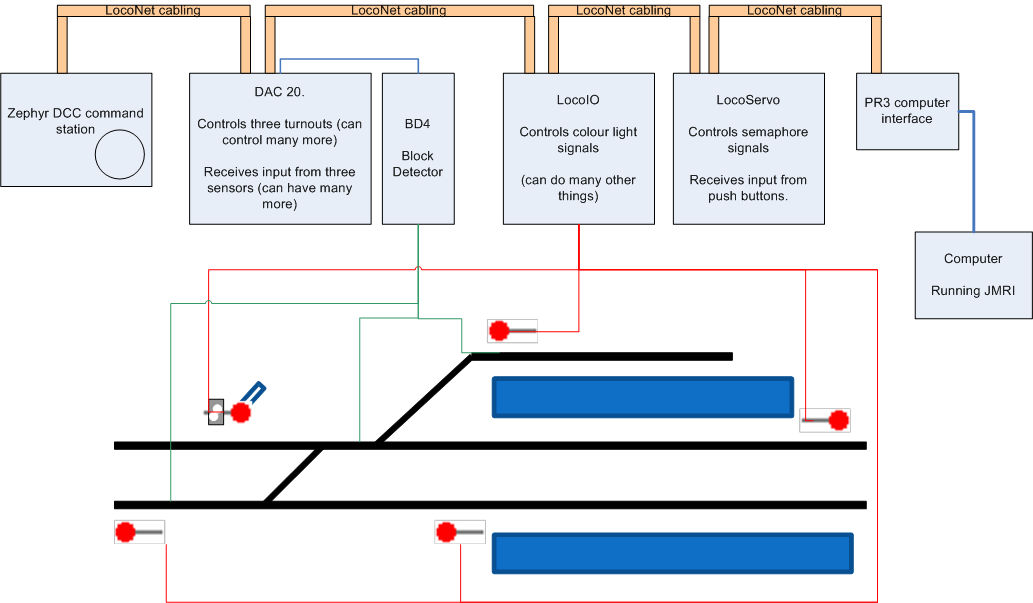 Our Command Station is a Digitrax Zephyr. This is linked to the computer running JMRI using a Digitrax PR3 computer interface. The turnouts are controlled using a CML Electronics DAC20 accessory decoder. In addition, that decoder can accept input from occupancy detectors, so we used a Digitrax BD4 occupancy detector to monitor four track sections. Our colour light signals are controlled using a LocoIO board (from Hans De Loof), and the Semaphore Signals are controlled by a LocoServo board (also HDL). The LocoServo has a few spare inputs on our demonstration, so we used those for push-buttons to set routes - thus there is a push button interface to set the track.