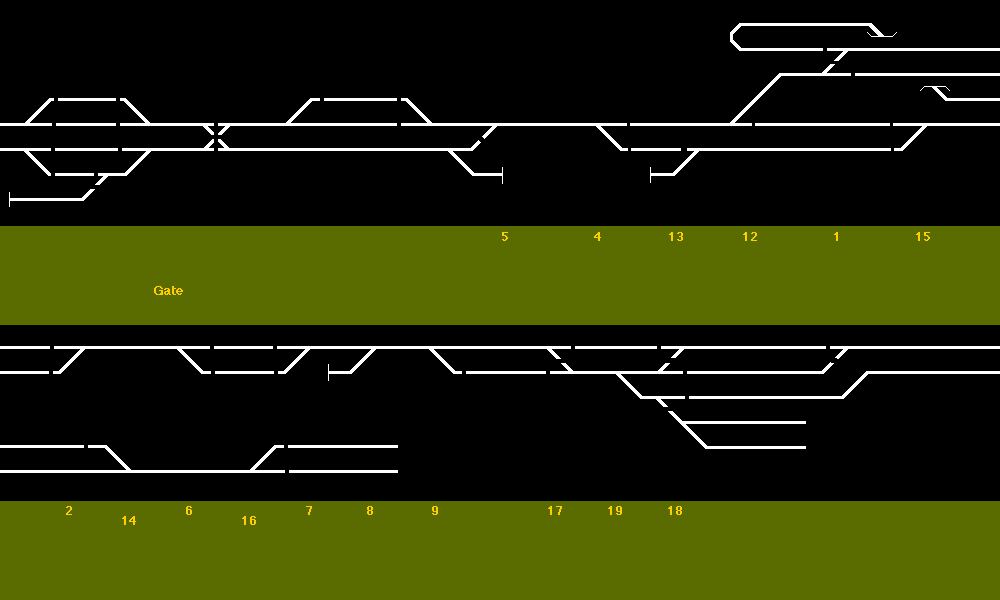 black background, with connecting lines for turnouts drawn at a 45 degree angle.