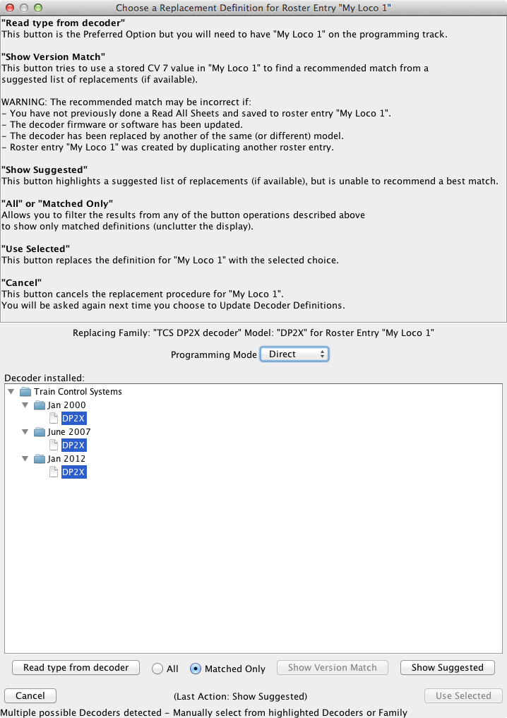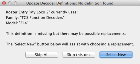 Note that an update defined this way is unconditional; if the family and model attributes match a roster entry, it will be updated to the new family/model. Automated conditional updates based on versionID or productID are not possible as these values are not stored in the roster entry. An interactive update process is now available in these cases and uses a special syntax: Since JMRI 4.9.5