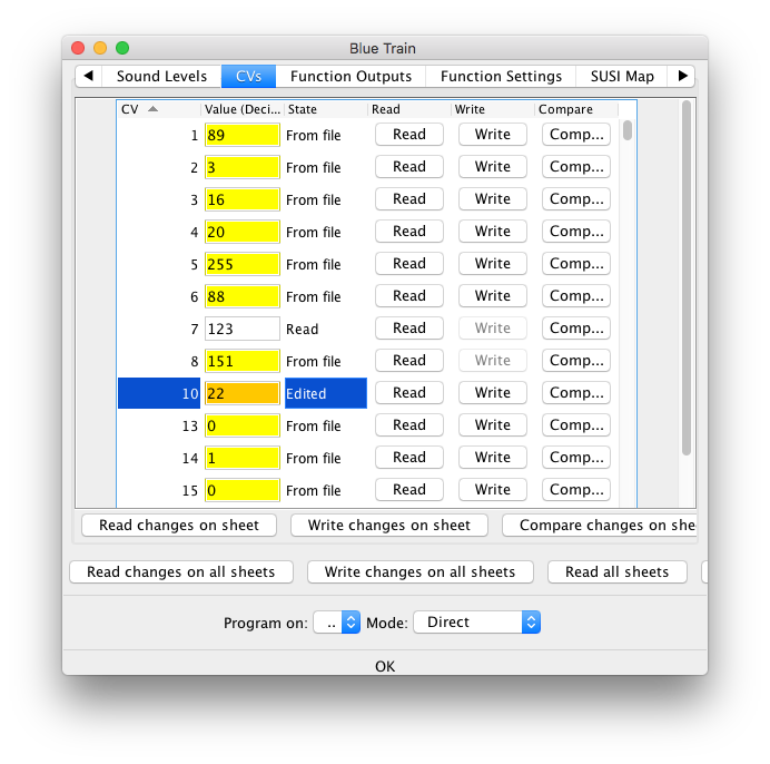 It is also possible to program the CVs directly using the CV Programmer. The "Read" and "Write" buttons allow you to work with individual CV contents. Changes made here will also update any associated values found on other programmer tabs.