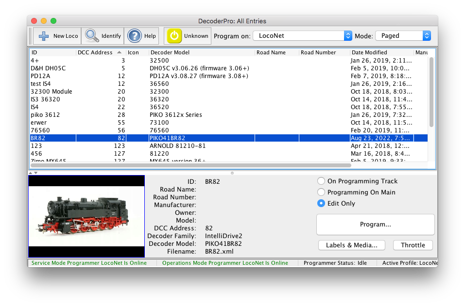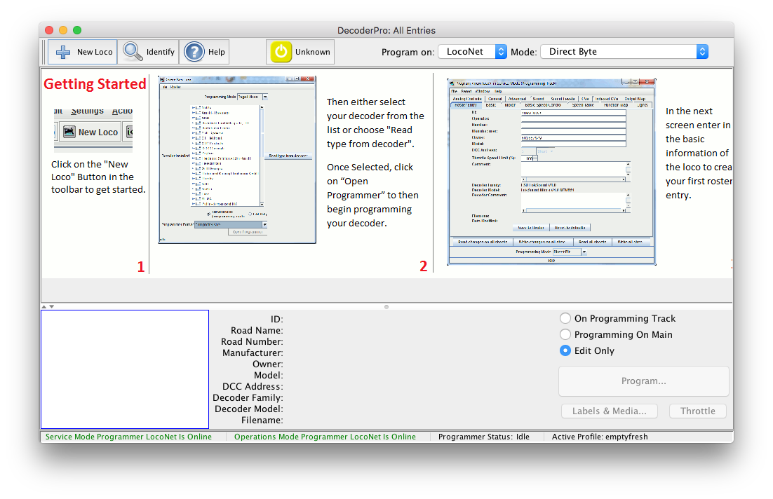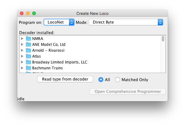 You'll get a new window to configure the programmer with information about a specific type of decoder, or an existing locomotive. This will become your locomotive roster as you program your decoders
