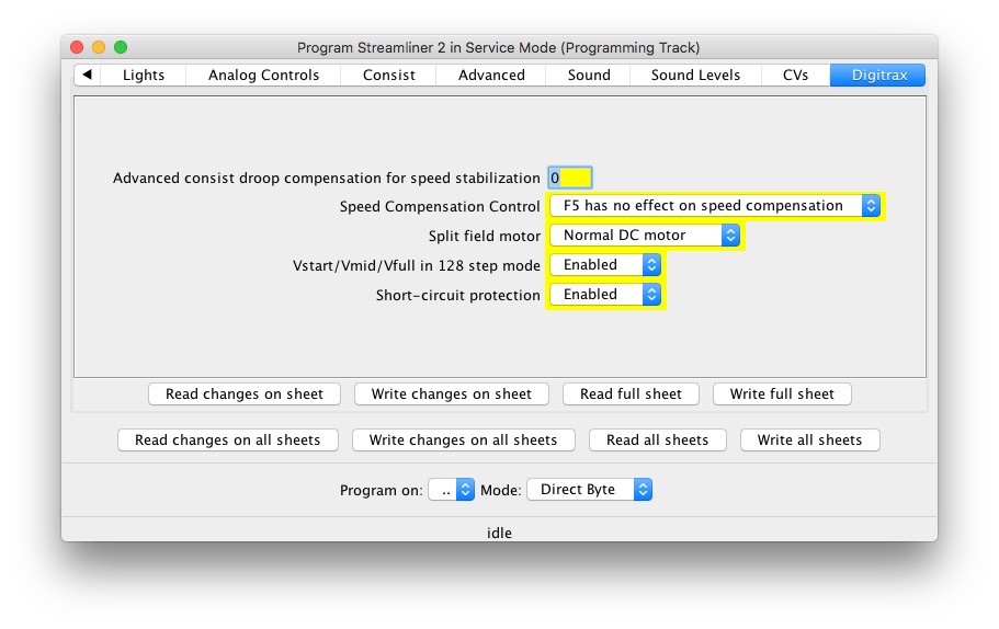 Although having a name for an entire CV is nice, where this really helps is with complicated bit-mapped options. Digitrax FX lighting options, for example, require configuring two sets of bits into one CV. Another example is configuring a Soundtraxx decoder's mapping between functions and sounds. This involves bits and values spread across a dozen different CVs, but DecoderPro turns that configuration job into simple checking of boxes.