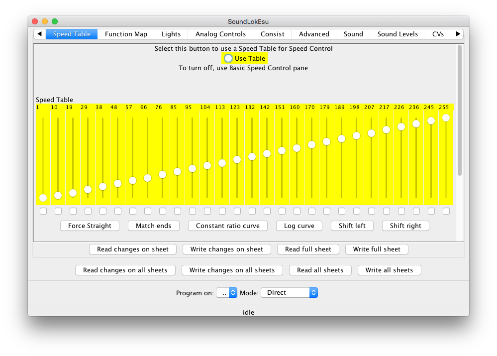 For example, after a "Read" the speed table values are shown on white in the first image, while in the second image it shows that when you modify a value, it's marked on yellow. Doing a write will set the color back to white; doing a read will reset the number to the value in the decoder, and also reset the field to white.