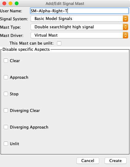 The User Name: can be anything. In this example, the entered name indicates that the signal mast is related to the right turnout at Alpha and will be placed at the throat (T) of the turnout. The suffixes for the signal masts at the frog end will be C for the straight leg (Continuing) and D for the curved leg (Diverging).