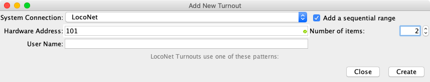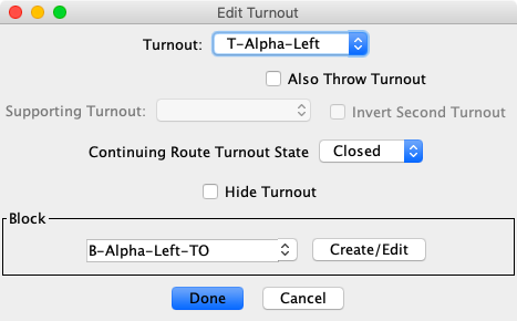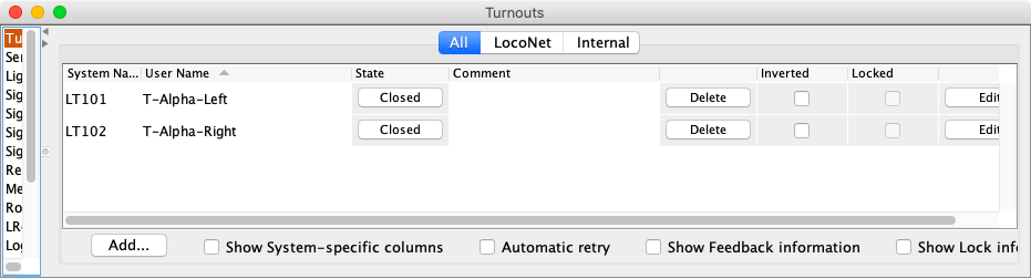 Turnouts are defined using PanelPro Tools ⇒ Tables ⇒ Turnouts. Click on Add. Two turnouts are defined and assigned user names: T-Alpha-Left and T-Alpha-Right.