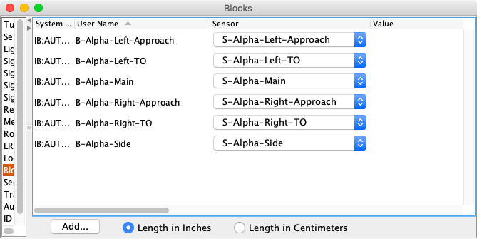 Use PanelPro Tools ⇒ Tables ⇒ Blocks to assign the occupancy sensors to each block. The blocks were automatically created when the block names were assigned using the Layout Editor Edit dialog for each piece of track. To simplify the process, drag the Sensor column next to the User Name column.