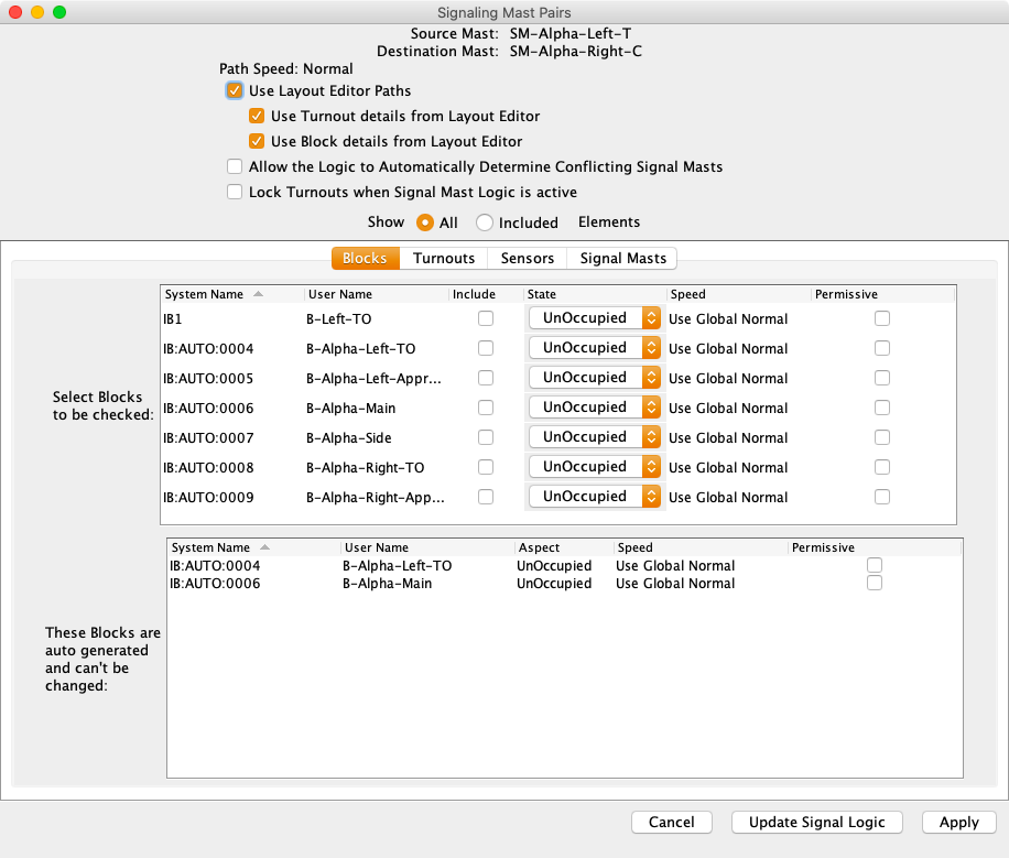 The next two images show the Block and Turnout tabs for the SML. The automatic sections were generated by the discovery process. The manual sections can be used to override automatic entries or add additional entries. If use Layout Editor Paths is turned off, then manual logic can be created. This might be needed for special cases.