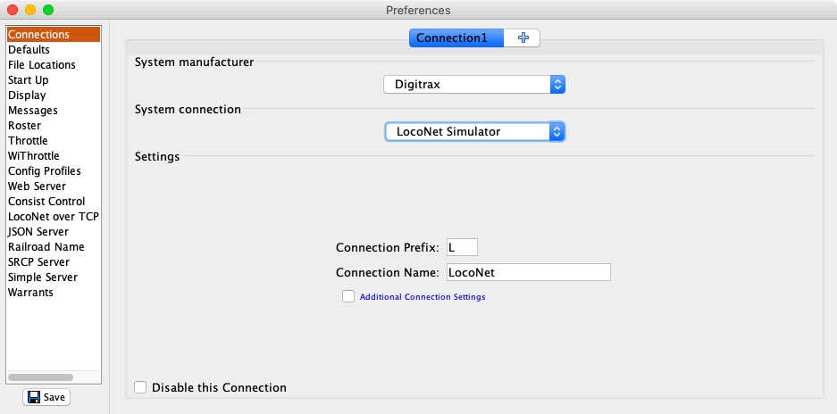 The first time PanelPro is started, a connection must be defined. For this exercise the Digitrax LocoNet Simulator will be used.