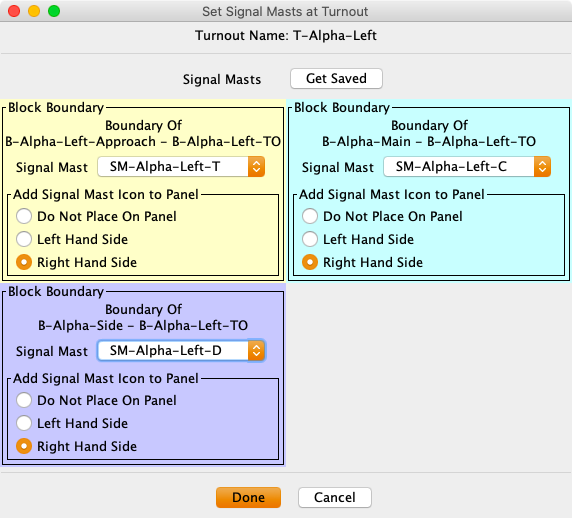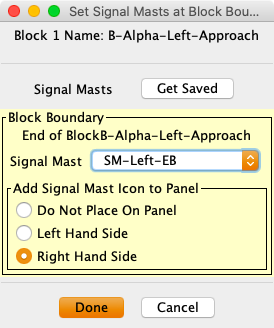 A dialog will be displayed with combo lists for selecting masts and options for placing the masts on the panel. Each box identifies the blocks that form the boundary. This helps with choosing the proper signal mast.