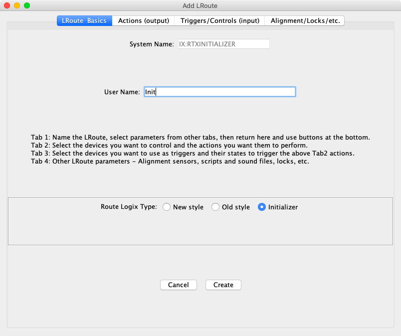 Click on the LRoute Basics tab, enter a name in the user name field and select the Initializer option. Click on Create.