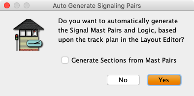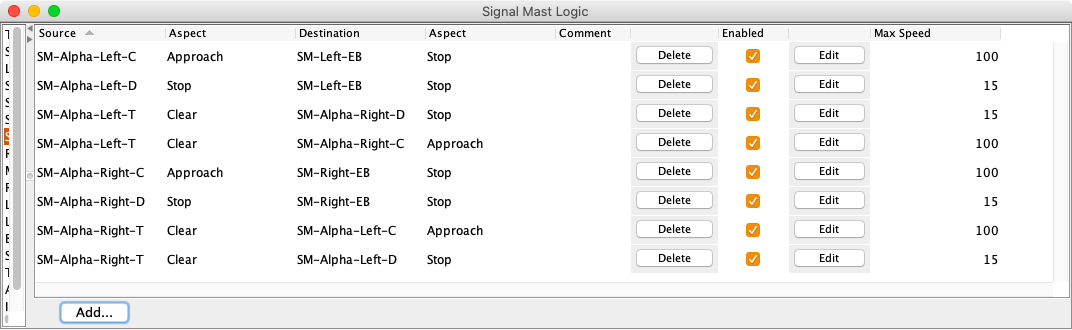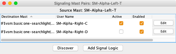 While it is possible to use the Add button to create each set of signal mast logic, use the Tools ⇒ Auto Generate Signaling Pairs menu item. This will discover all the signal mast pairs and build the signal mast logic definitions.