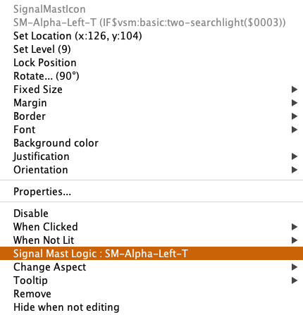 The Layout Editor Toolbar has a selection for adding signal mast icons to the panel. This results in an unconnected icon that is not related to any block boundary. The proper method is to use the Set Signal Masts item from the context menu. Right click a turnout, level crossing, end bumper, anchor point or edge connector that forms a block boundary. If the block boundary is valid, there will be an entry for Set Signal Masts.
