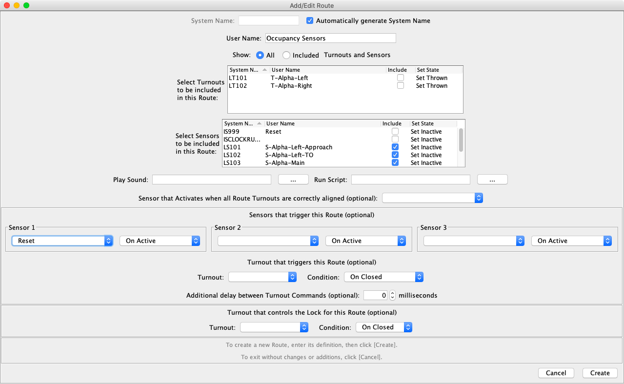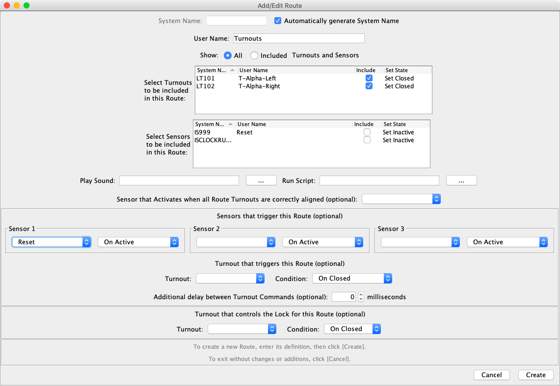 Routes are defined using PanelPro Tools ⇒ Tables ⇒ Routes. Click on Add. Select Automatically generate System Name, enter a Route user name, select the two turnouts and set the state to Close. Select the Reset sensor from the Sensor 1 list. Click on Create.