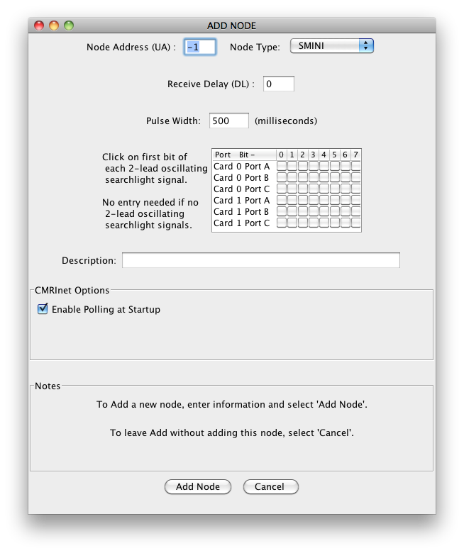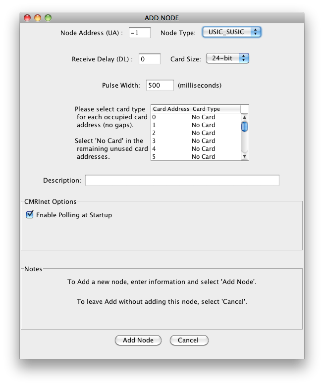 Open the Node Configuration Window from either the Preferences window or from the PanelPro main menu, select C/MRI⇒Configure Nodes.