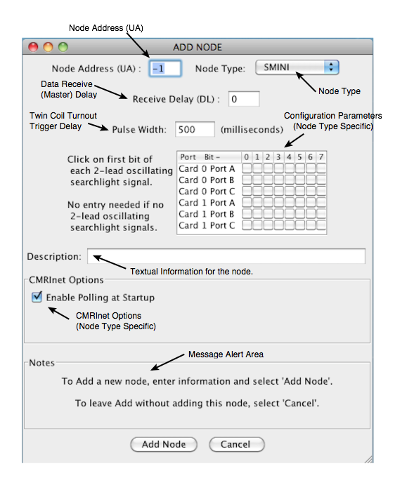 An SMINI, USIC/SUSIC, or cpNode is called a "node". A node is a point in the CMRInet network where the physical connections for controlled layout equipment is done. Before using C/MRI with JMRI, you must tell JMRI what nodes you have attached to each C/MRI system connection and the configuration of each node.