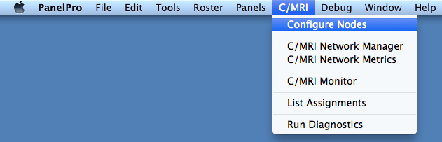 To open the Node Configuration Manager window from the PanelPro Main menu, select the name of the specific C/MRI connection to get the pulldown. If there is only a single C/MRI connection, that will be C/MRI⇒Configure Nodes. You may also click on the "Configure CMRInet nodes" button in the Preferences window for the specific C/MRI connection.