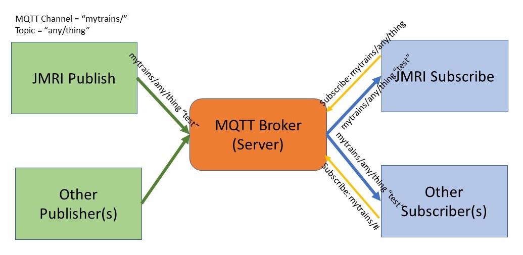 MQTT is a "client-server publish-subscribe" protocol, meaning that JMRI connects to an MQTT server (called a "message broker") and subscribes to receive messages on certain "topics." JMRI also publishes messages to the MQTT message broker and any device (on or off the layout) subscribed to the published topic will receive a copy. This approach allows JMRI users to use MQTT communication in developing any number of layout control and automation scenarios. For example, you can use JMRI's MQTT capability to communicate with IOT devices as well as arduinos and other microcontrollers.
