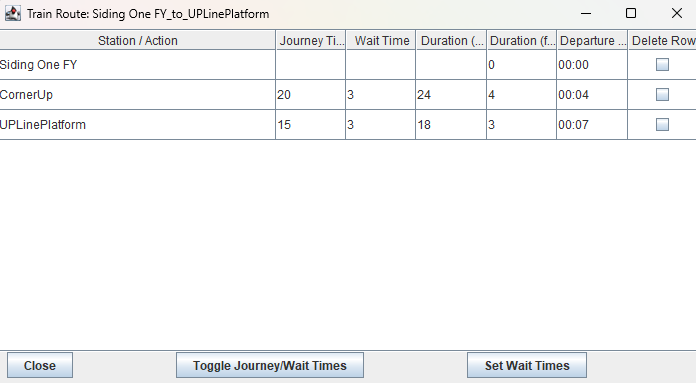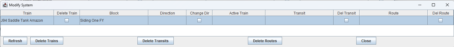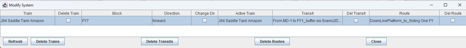 Suppose we lift the train and transfer it to Siding One, we press the ‘Refresh’ button but the transit still shows. We click the check box by ‘Del Transit’ and the transit is closed down. The route disappears as well. We are now ready for the next route in the Schedule going from Siding One.