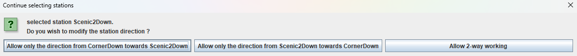 The system of setting station direction using a block was designed for a system where the area of one way working had no possibility of putting a station in, but we will illustrate it by setting the block containing the station CornerUp to one way working, assuming that the stations Scenic2Up, CornerUp and ML-MLD do not exist.
