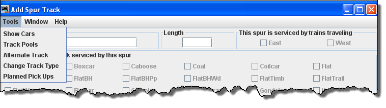 This opens the Add Spur Track window. Note most of the pane is greyed out