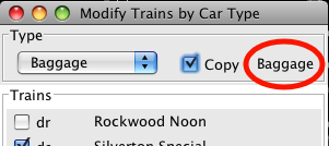 Opened from the Trains window Tools menu. Use this tool to quickly modify the type of Cars your Train will service. It's useful when adding a new Car Type to your Roster.