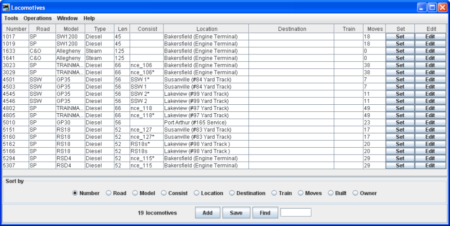 Of course, we'll need Motive Power to pull our train, so let's look at what's in the Locomotives Table.