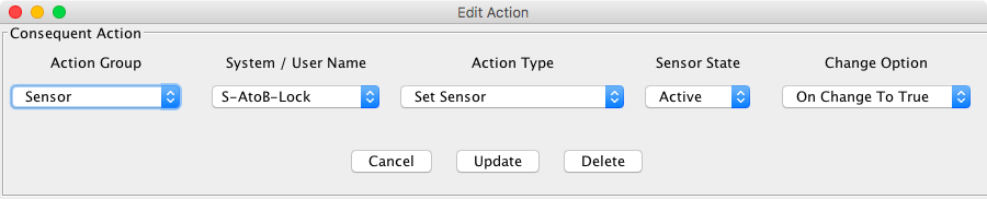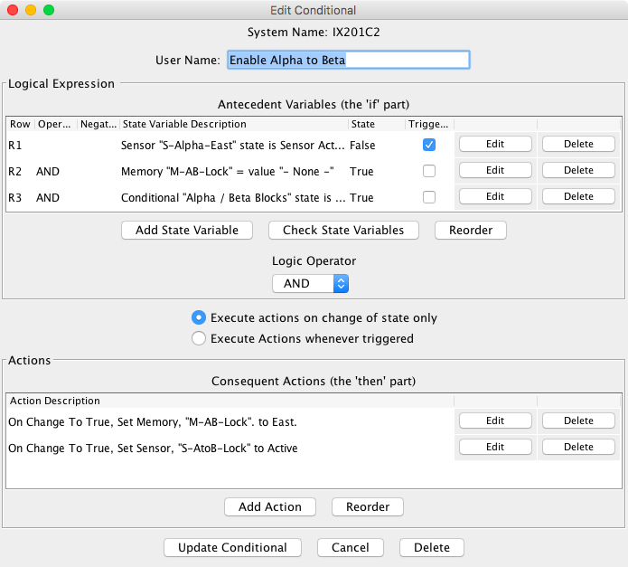 These refer to the calculated state of the Conditional, which is equal to the value of the logical expression as specified in the state variable table. One of these options must be selected. When done, click either "Update" to install your changes, "Cancel" to close the window without any changes or "Delete" to remove the action entirely.