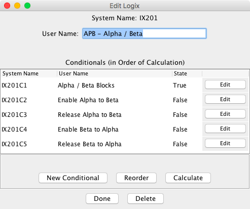 When Done is clicked at the bottom of the Edit Logix window, any change in the Logix user name is checked and made. A check is made for inconsistencies in specifying that an entity (sensor, turnout, etc.) referenced in multiple state variables is not monitored as a trigger for calculation of the Logix, and a warning message appears if any inconsistencies are found. Then the Logix is activated, the Edit Logix window is dismissed, and the user is returned to the Logix Table. Immediately before the Logix is activated, the state of all its Conditionals is set to UNKNOWN. Immediately after activation, all Conditionals are calculated.