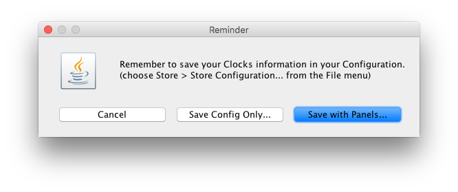 If you select a display clock in the Start Selected Clock popup menu, that clock display will be automatically started when your file is loaded. Clocks displayed on a PanelPro panel are configured using Panel Editor or Layout Editor, and are saved and restarted with your panel.