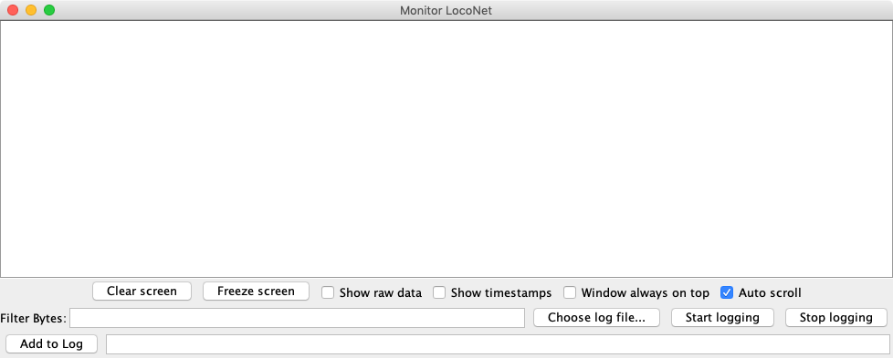 The "Filter Bytes:" text entry area on the LocoNet monitor window may be used to specify one or more LocoNet message "OpCode(s)". When the LocoNet monitor is notified of a LocoNet message, the message's OpCode value is compared to the hexadecimal value(s) in the "Filter Bytes:" text entry area. If the message's OpCode value is specified in the text entry area, then the LocoNet monitor will ignore the message.