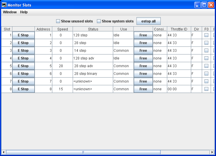 The Slot Monitor tool displays a table of the "command station slots'" contents. Slots are used to control individual locomotives and consists. The display includes the decoder's speed step format, current speed and function settings, consist information and status. You can choose to show either all slots or just the ones being actively used.