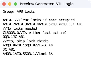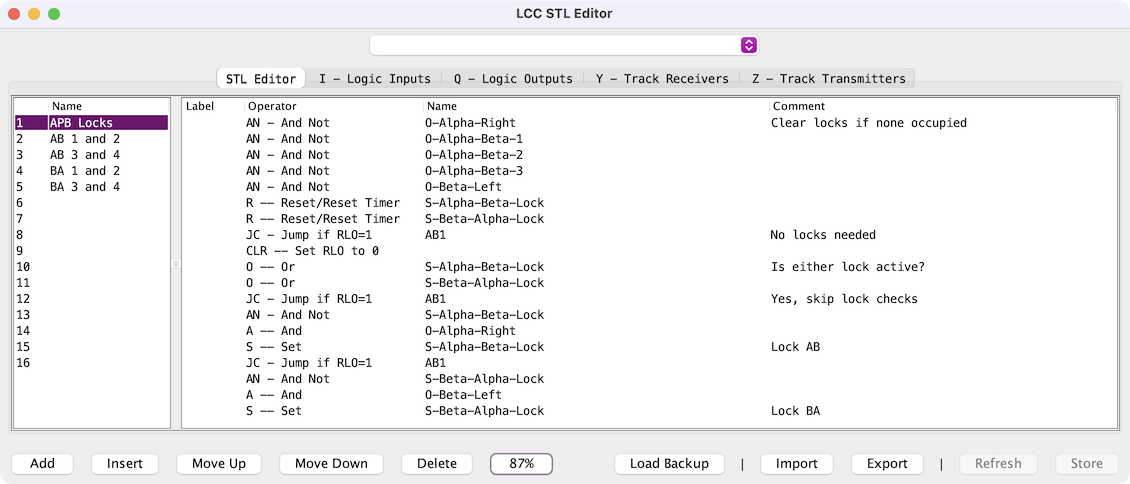 The STL Editor provides an alternative method for editing the STL code. It translates the code into a table that has 4 columns. The Label column has the jump labels. These are one to four character words and a colon (:). The Operator column contains a drop down with all of the PLC operators. The Name column contains names. This will have the user friendly name if one was defined in the IQYZ (input, output, receiver, transmitter) tables. Other "names" include labels for jump operators, timer definitions, Mn.n memory variables, etc. The Comment column is for comments. Note: Comments take up a lot of room.