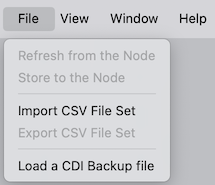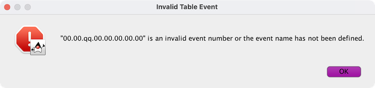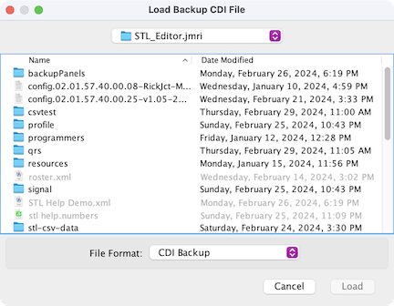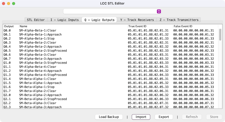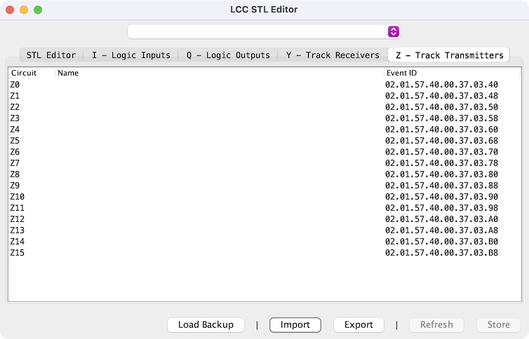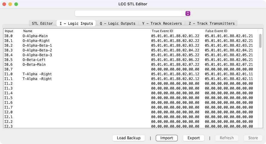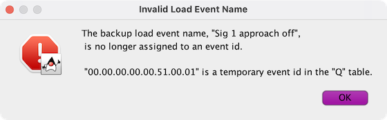 Older CDI backup files can have an event name instead of an event id. The load process will use the event name to find the current event id. If the event name no longer exists in the "name store", a temporary event id will be created. The format of the event id is 00.00.00.00.00.AA.BB.CC. AA will be hex value of the table type. These are IQYZ. The BB and CC hex values will the table group and items. The I and Q tables have 16 (0-15) groups and 8 (0-7) items per group. The Y and Z tables have 16 (0-15) rows and a single item that is always zero. A dialog will be displayed when a temporary event id is created.