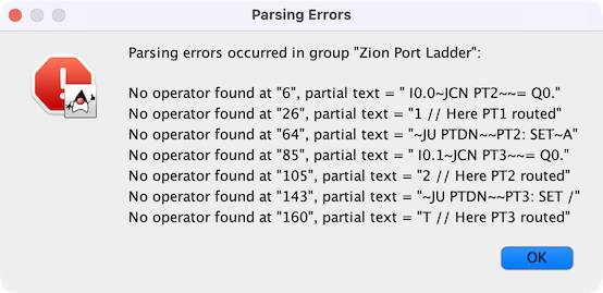 When CDI content is being loaded into the STL Editor, the content is translated from a series of characters into a logical structure consisting of labels, operators, variables and comments. If the translation fails, the Parsing Errors dialog will be displayed.