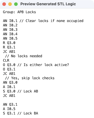 In this image, the output events are signal aspects. The aspect will be sent when the variable changes to true. The sample PLC code at the beginning of this page shows 3 aspects being set to false. The subsequent logic will set one of them true. The net result is that at most one aspect will change from true to false and one will change from false to true. Most of the time, one variable will be set to false and then back to true. Only an occupancy change, turnout change or destination mast change (link speed) will result in two variables changing. The aspect false events use a zeros event with the aspect id in the last two bytes.