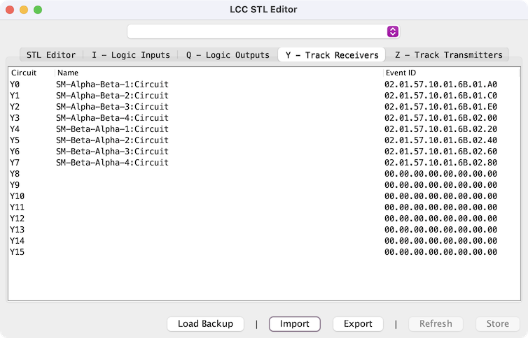 The actual receiver variable names consist of the row number and the speed number, such as Y0.7. That is the "Clear" speed for the first circuit. For the STL Editor, the Yn.n names are converted to the friendly name with a tilde and the speed number, such as SM-Alpha-Beta-1:Circuit~7.
