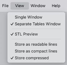 The IQYZ tabs are moved to a second window while the STL Editor tab remains in the main STL Editor window. The tables window cannot be closed while the Separate Tables Window option is selected. The window is hidden when the Single Window option is selected.