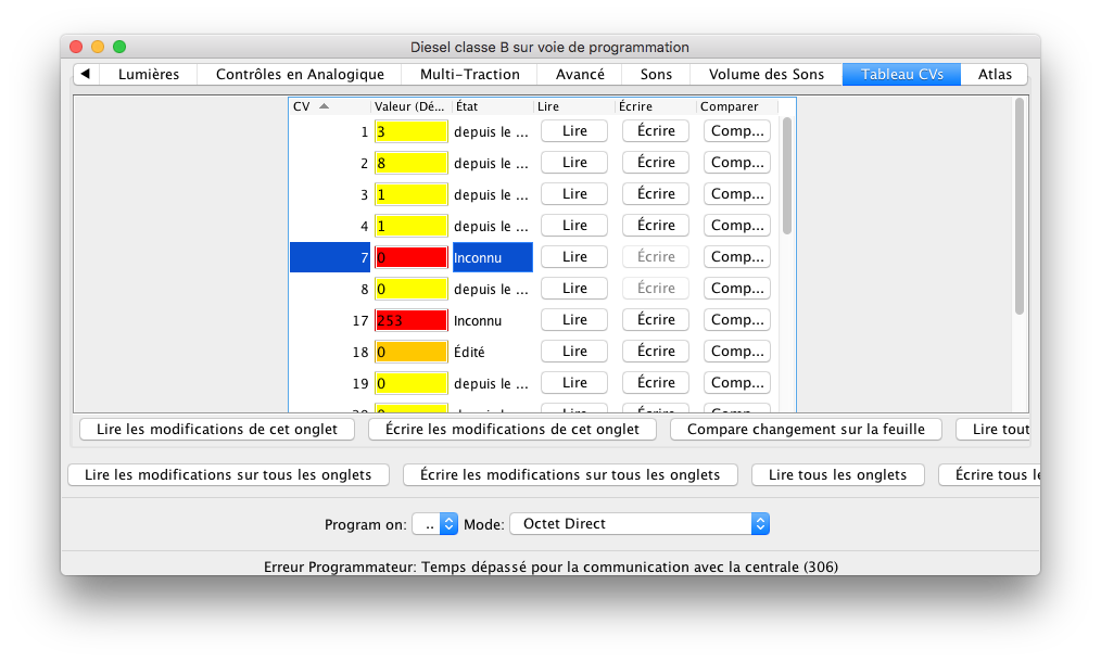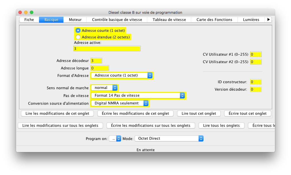 Chaque zone de sélection, case à cocher ou bouton radio est mappé dans un bit(s) spécifique(s) dans les CV du décodeur. Le programmateur gère la lecture et l'écriture des CV lorsque les paramètres individuels sont modifiés. Au lieu de bits, vous travaillez avec le nom ou la description du manuel du décodeur.