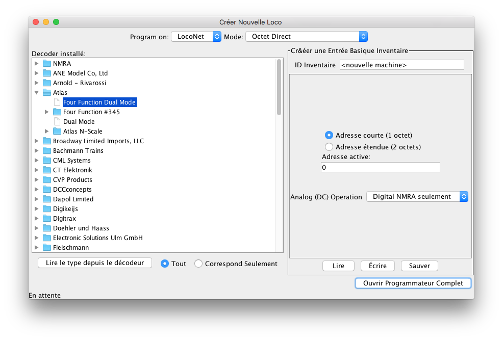 Vous obtiendrez une nouvelle fenêtre pour configurer le programmateur avec l'information d'un type particulier de décodeur, ou d'une locomotive existante. Cela va devenir votre inventaire de locomotive quand vous programmerez vos décodeurs.