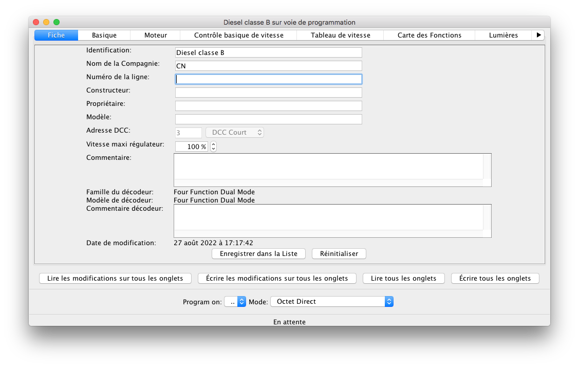 Un nouveau volet vous sera présenté, s'ouvrant sur le premier onglet « Entrée de liste ». Entrez toute information sur le modèle de locomotive et le décodeur installé. Rien de tout cela n'est programmé dans le décodeur, à l'exception de l'adresse, mais vous ne pouvez pas le modifier ici. Encore vous pouvez garder quelques notes ici pour suivre les internes de votre modèle.