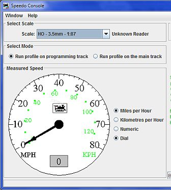 Lorsque le Bachrus MTS-DCC est défini comme une préférence de connexion de réseau, l'outil Console Speedo peut être utilisé pour afficher l'échelle de vitesse de circulation aux échelles de Z à O et au-delà.